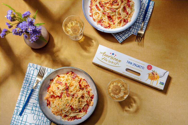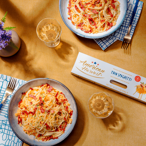 Thin Spaghetti a la Gricia with crispy bacon, creamy cheese sauce, and a touch of thyme. Simple and delicious!